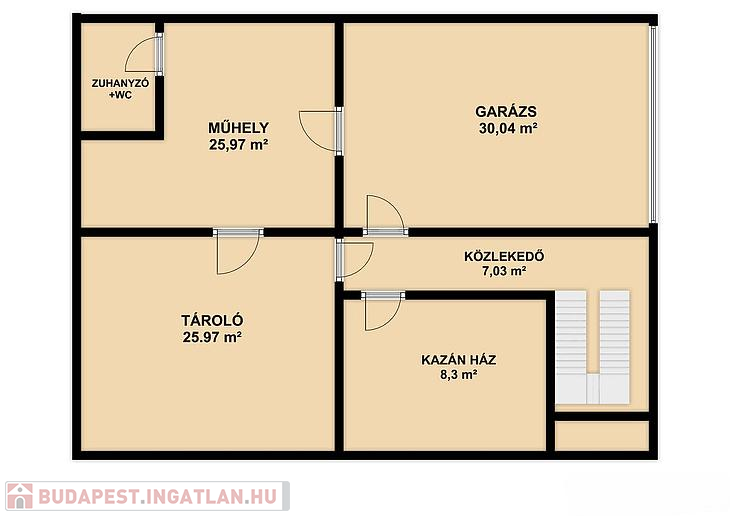 Szuterén: Kazánhelyiség, 2 tároló, zuhanyzó + mellékhelyiség, garázs.
