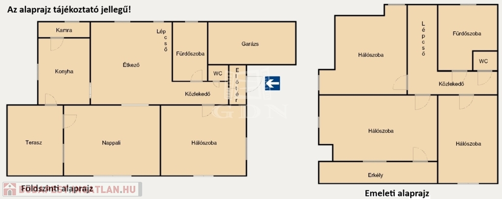 A földszinten, amerikai konyhás nagy étkezős nappali, hálószoba, fürdőszoba, külön wc, közlekedő, terasz , garázs kapott helyet.