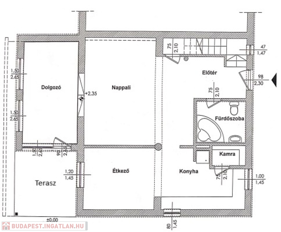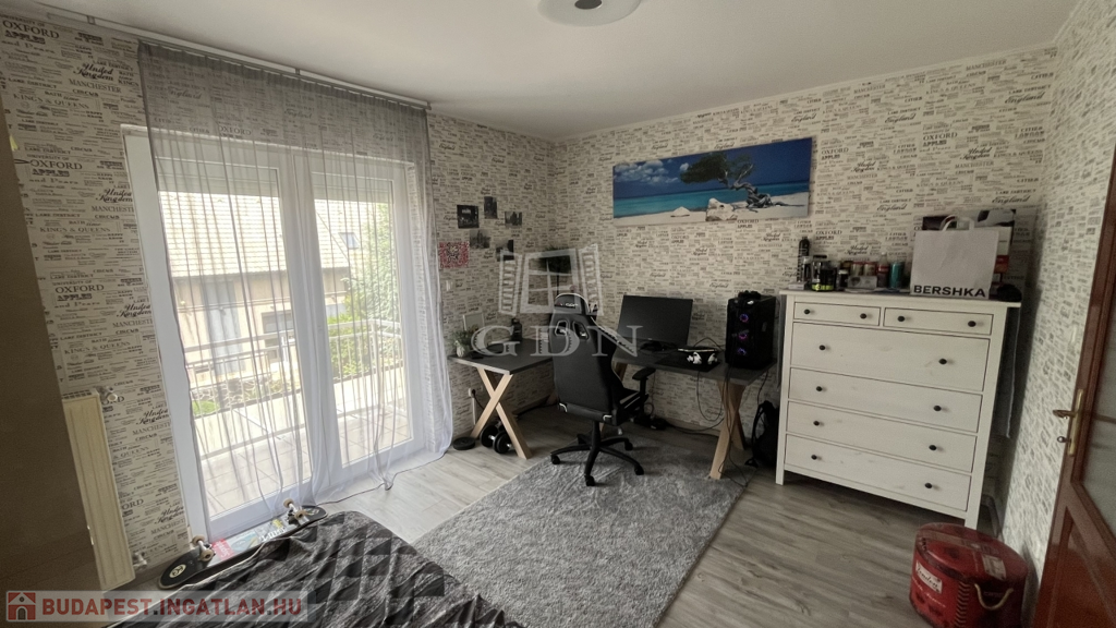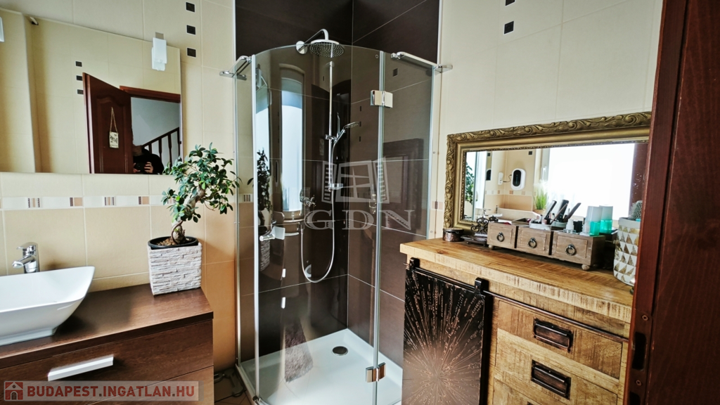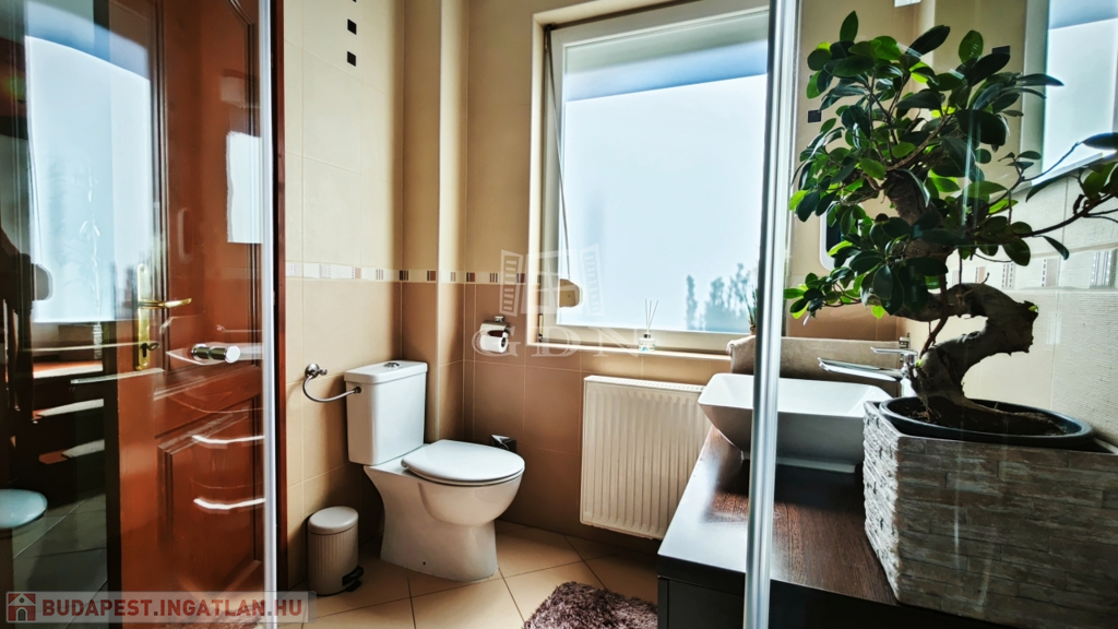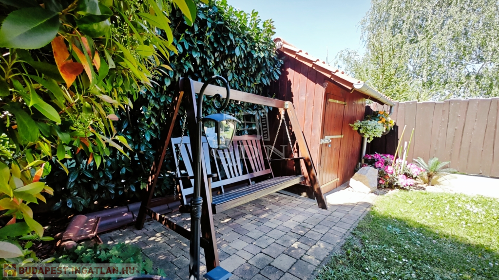 A 320 m²-es telket kerttervező cég álmodta meg, így a gondozott kert tökéletes kiegészítője az elegáns otthonnak. A hátsó kertből közvetlen kijárás nyílik a fedett teraszról, amely a 2012-ben hozzáépített, 13 m²-es szinteltolásos dolgozószobán keresztül közelíthető meg – itt padlófűtés is növeli a komfortérzetet.