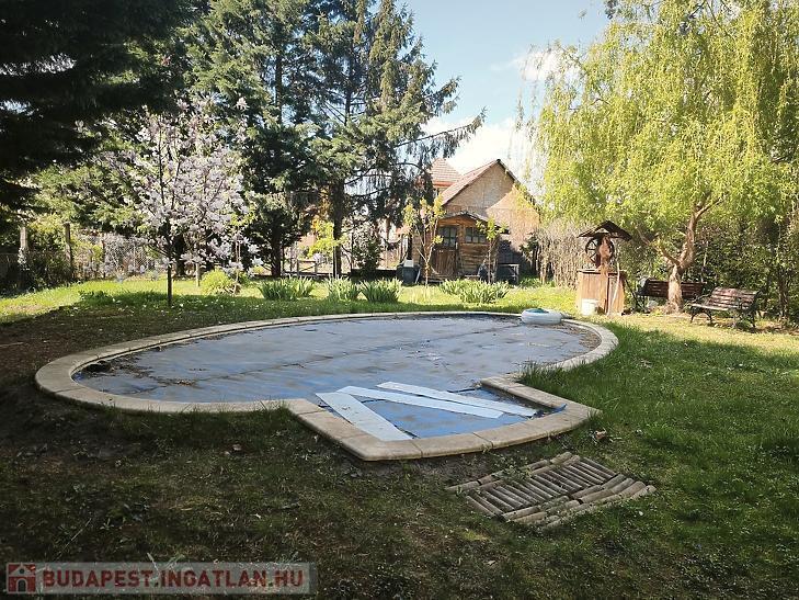 A telken található egy fa melléképület és egy medence.
