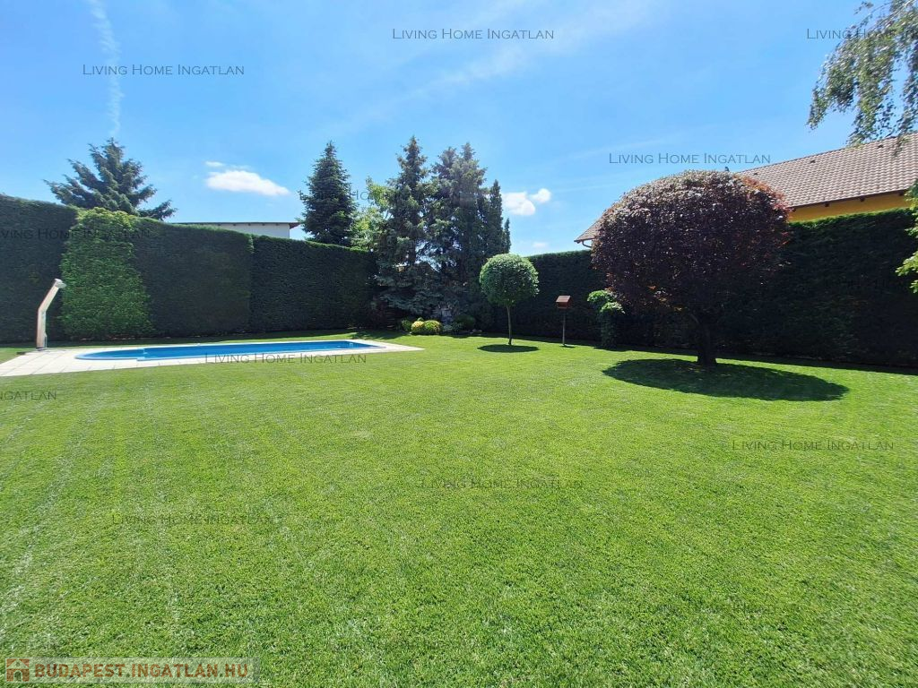 A kertje kertész által gondozott, parkosított, füvesített (automata öntözőrendszer, mely saját kútról működik), örökzöldek, fák, rózsák teszik csodálatossá. A kerítések mentén a magasra nőtt, szépen nyírt sövények biztosítják a szomszédoktól és az utcáról a lakók számára a teljes intimitást. A kert egyik sarkában egy mesterséges nagyméretű csobogó-vízesés látványát és hangját élvezhetjük. A kerti medence mérete 8x4 m és 1,5 m mély, mely fűthető is.