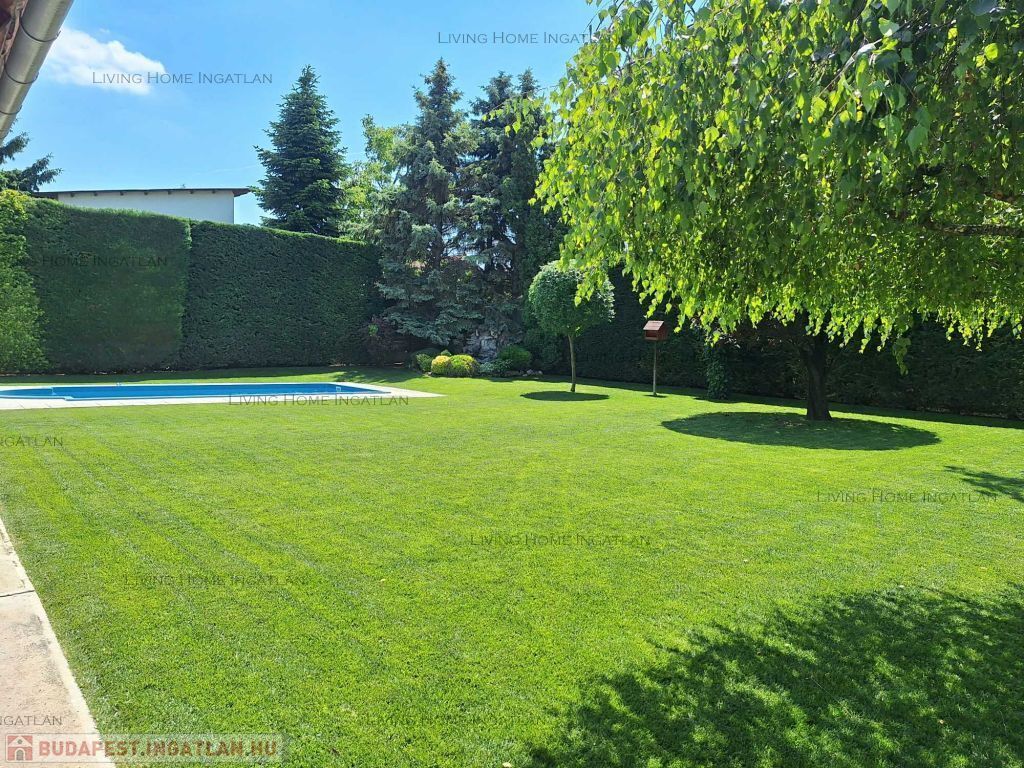 A kertje kertész által gondozott, parkosított, füvesített (automata öntözőrendszer, mely saját kútról működik), örökzöldek, fák, rózsák teszik csodálatossá. A kerítések mentén a magasra nőtt, szépen nyírt sövények biztosítják a szomszédoktól és az utcáról a lakók számára a teljes intimitást. A kert egyik sarkában egy mesterséges nagyméretű csobogó-vízesés látványát és hangját élvezhetjük. A kerti medence mérete 8x4 m és 1,5 m mély, mely fűthető is.