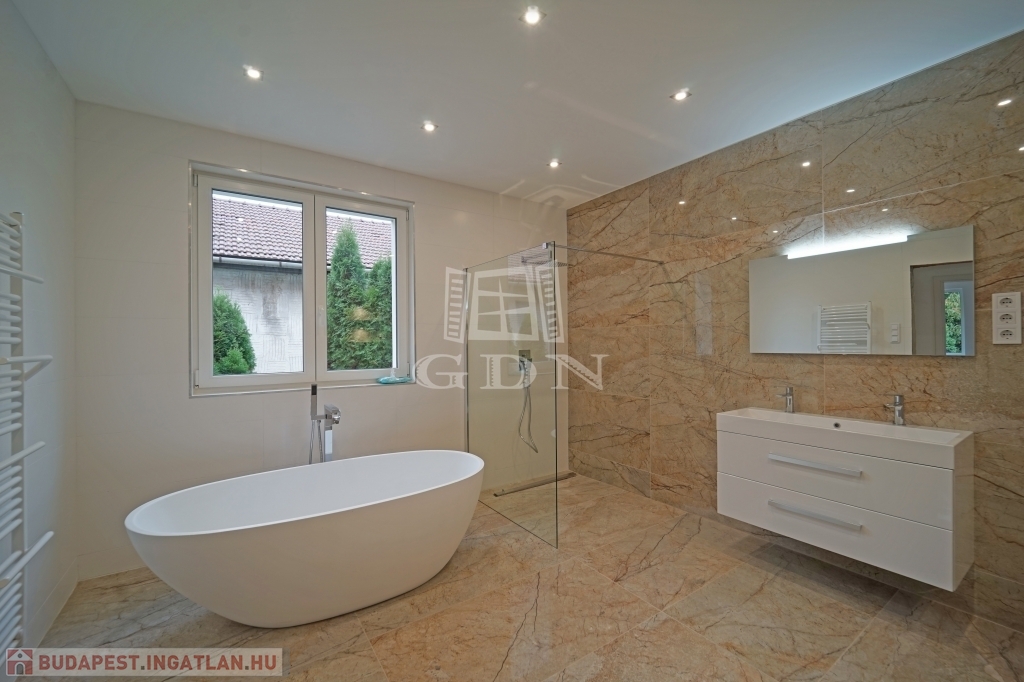 Budapesten a XVII. Kerületben a Pesti útról nyíló 848m2-es telken, eladó egy nettó 523m2-es 7 szoba + 2 nappalis, fűthető belső medencés, háromszintes luxus családi ház.