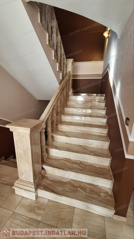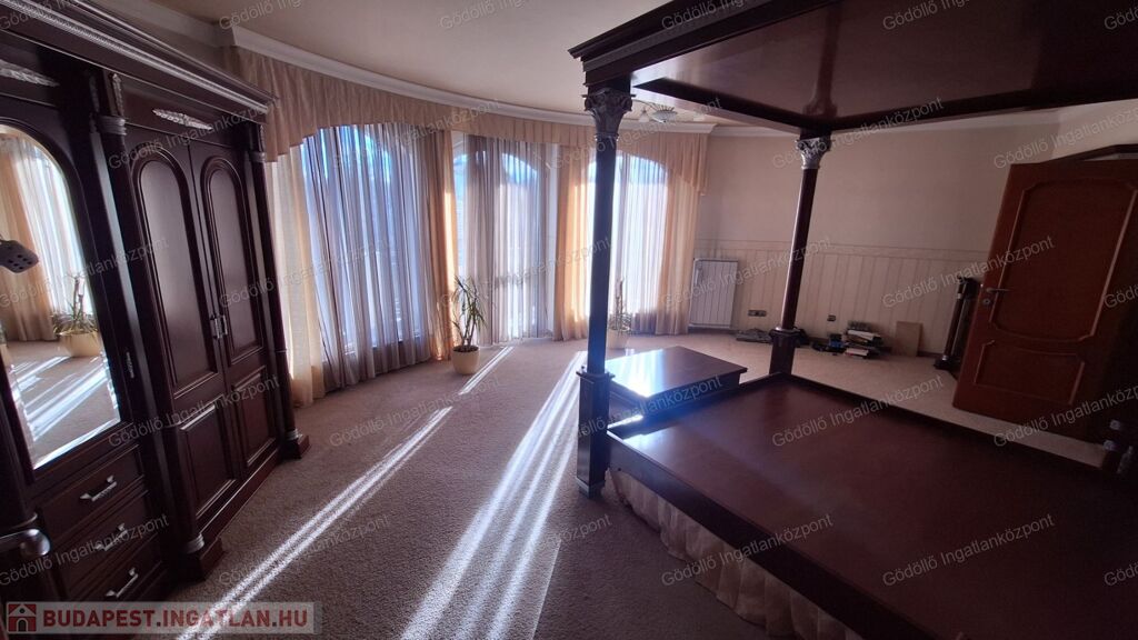 A felső szinten négy hálószoba, két fürdőszoba és több gardróbhelyiség található, klimatizált helyiségekkel és elektromos redőnyökkel.
