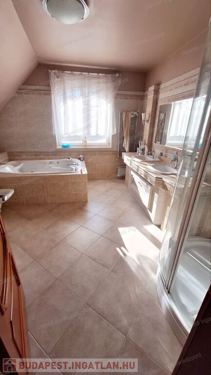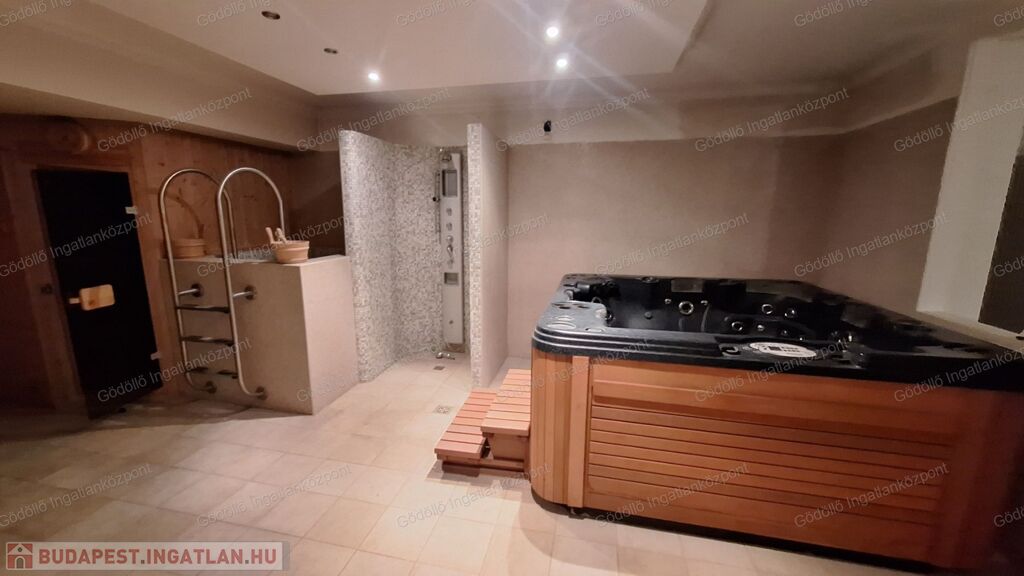 Az alsó szint igazi kincs: tárolók, gépészeti helyiségek, külön WC, tágas hobbiszoba, valamint egy teljes felszereltségű wellnessrészleg finn szaunával, jacuzzival és merülőmedencével.