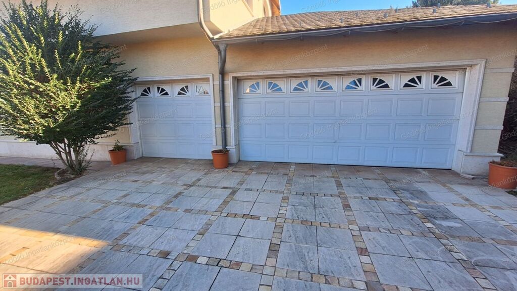 A kertben medence és jacuzzi biztosítanak pihenési lehetőséget. Ugyanezen a szinten található vendégmosdó, nagy előtér beépített szekrényekkel, kamra, háztartási helyiség, és a háromgépkocsis garázs.