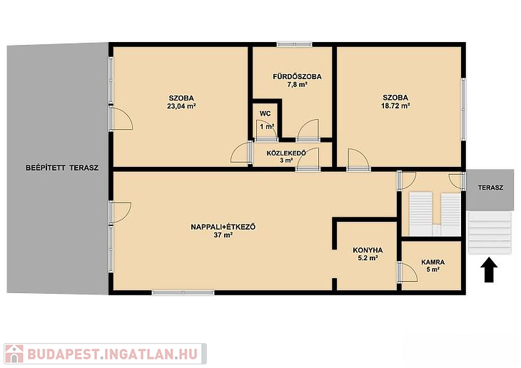 ELRENDEZÉS: 2 szoba, étkezős nappali, konyha, zuhanyzós + kádas fürdőszoba, mellékhelyiség, beépített terasz, kamra.