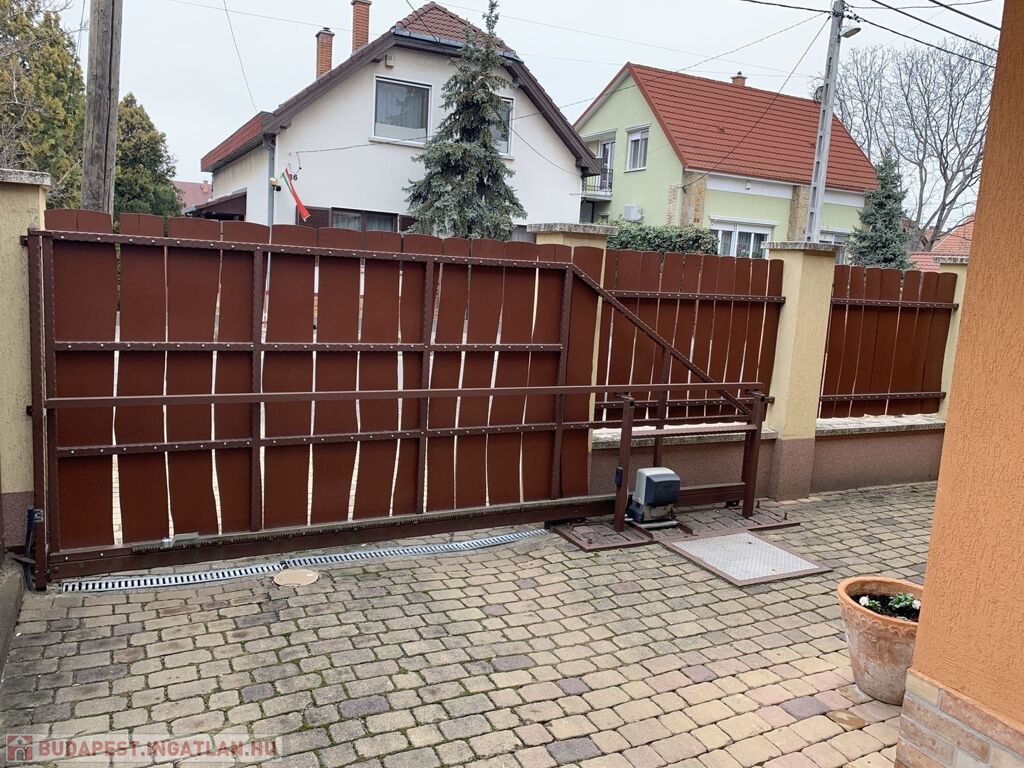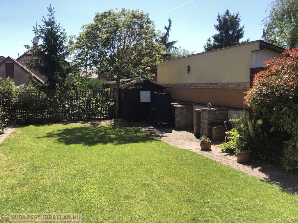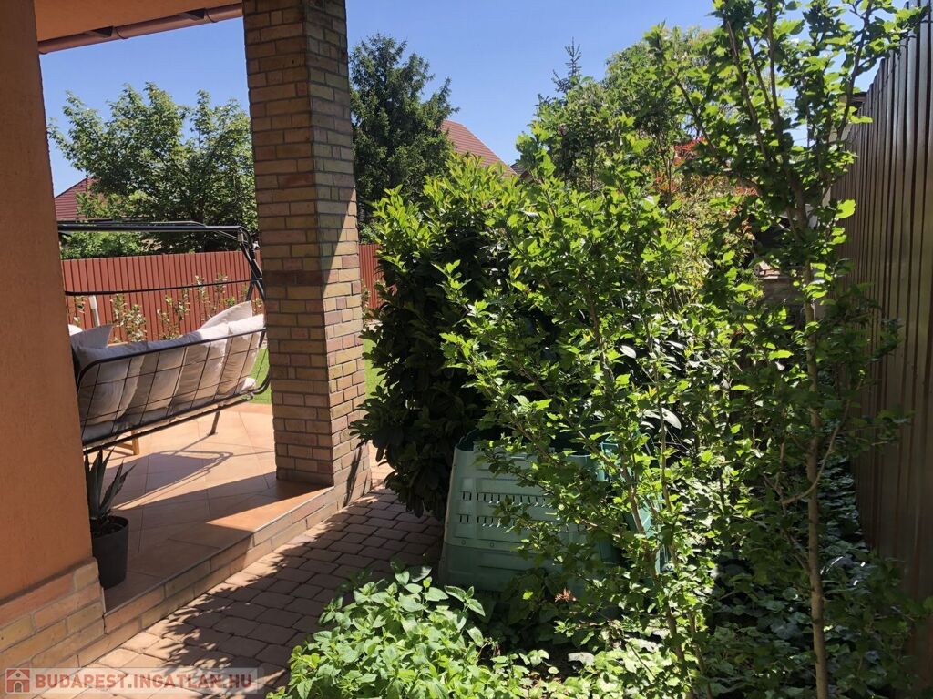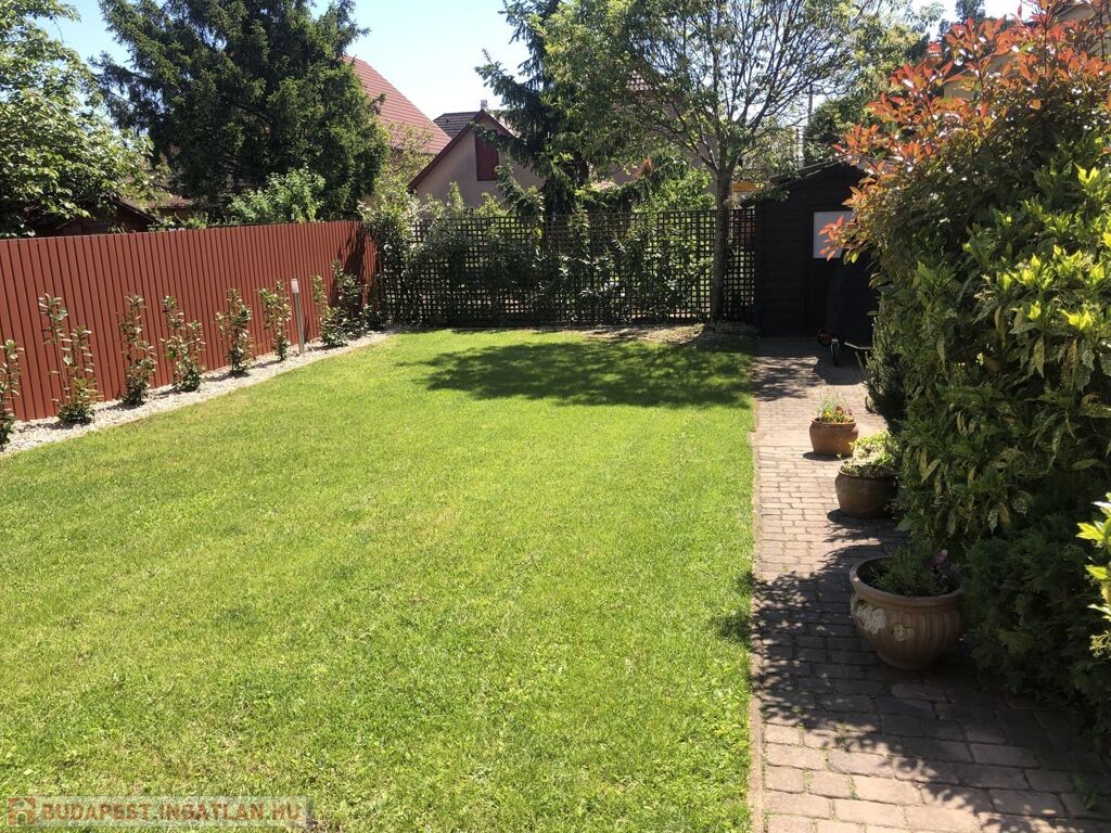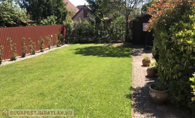 A kert maga igazi zöld oázis: az automata locsolórendszer nemrégiben került felújításra, a korábbi tujasor helyére babérmeggybokrok kerültek, amelyek jól tűrik a mediterrán jellegű klímát, így a kerítés mentén egész évben gondozott, zöld látvány fogad. Az udvart új, modern válaszkerítés határolja az ikerszomszéd felé, a kert többi részét körülölelő fakerítés pedig tavaly friss festést kapott. A kerti tárolásról egy kis faház gondoskodik, amely tökéletes kerékpárok, kerti szerszámok vagy gyerekjátékok elhelyezésére. Az udvar térkövezett részén akár három autó is kényelmesen parkolhat egymás mögött, elektromos kapu biztosítja a gyors ki- és bejutást.