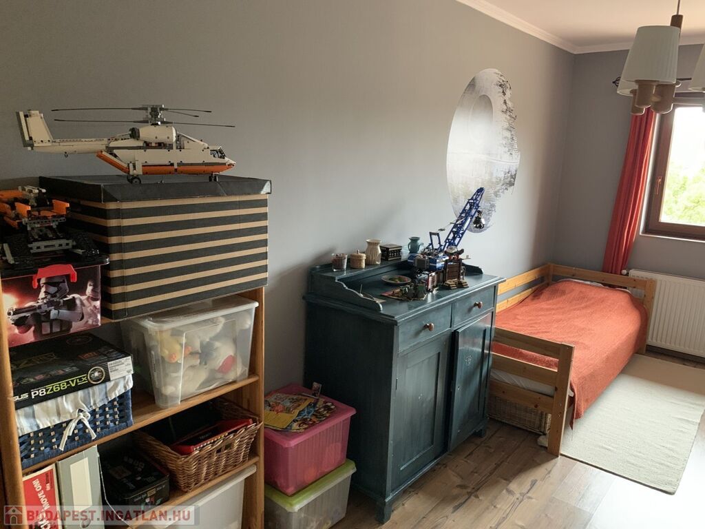 Az emeletre fa borítású lépcső vezet fel, ahol két tágas hálószoba található mindkettő ideális akár gyerekszobának, akár dolgozó- vagy vendégszobának is. A szinten kapott helyet a második fürdőszoba, amelyben pezsgőfürdős kád, dupla mosdókagyló és WC is rendelkezésre áll. Innen egy padláslétrán keresztül feljuthatunk a tárolásra is alkalmas padlástérbe.
