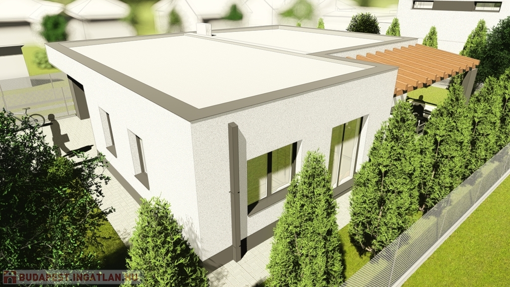 Az épület elején a bejárat és egy garázs kap helyet, a garázsból is van egy bejutási lehetőség az előszobához. Az épületben két fürdőszoba, egy háztartási helyiség is helyet kap, sok tárolási lehetőség biztosítható. A közlekedőről nyílik minden helyiség, így nem zavarja a nappali zaja a nyugalmat. Az épület 3 db 14 m2-es hálószobával rendelkezik. A nappali és a konyha-étkező egy légtérben helyezkedik el 43 m2-en, ahonnan ki lehet jutni a 22 m2-es, pergolával árnyékolt, modern megjelenésű kertkapcsolatos teraszra. A nappali terek nagy ablakokkal vannak ellátva, így kellő fényt biztosítva, a pergolával árnyékolt terasz mégsem engedi be a nyári forróságot. A szobák is nagyobb ablakokat kaptak, így biztosítva a szükséges mértékű természetes fényt. Az épület lapostetős, modern kialakítással épül egy folyamatosan frissülő és fejlődő környezetben.