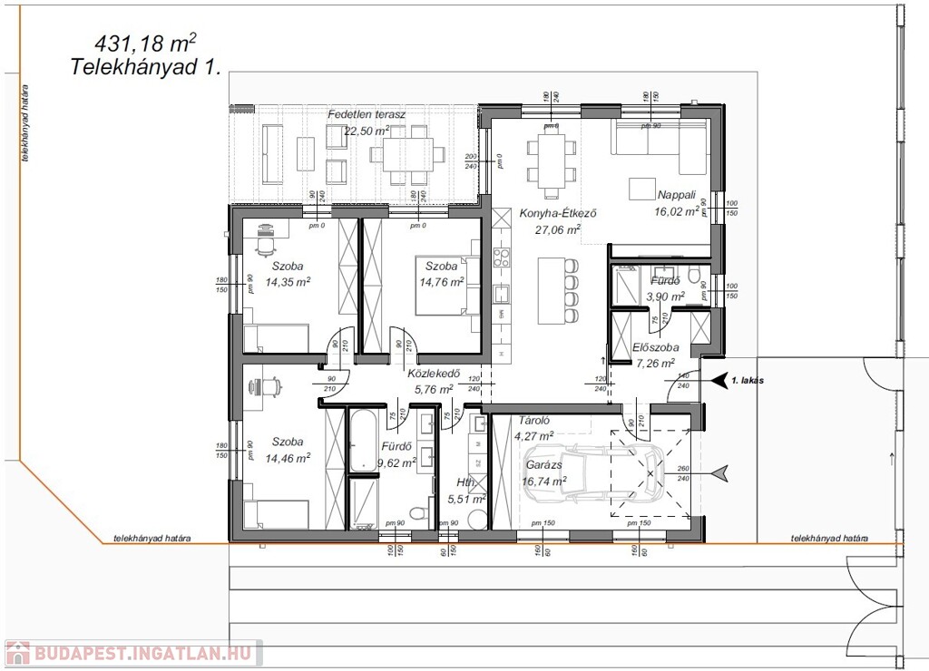 Az épület egy osztatlan közös megosztással leválasztott, kétlakásos telken helyezkedik el, a saját telekhányad mérete 431 m2. Az épület nettó 140 m2-es, bruttó 174 m2-es, szabadonálló beépítéssel épül.