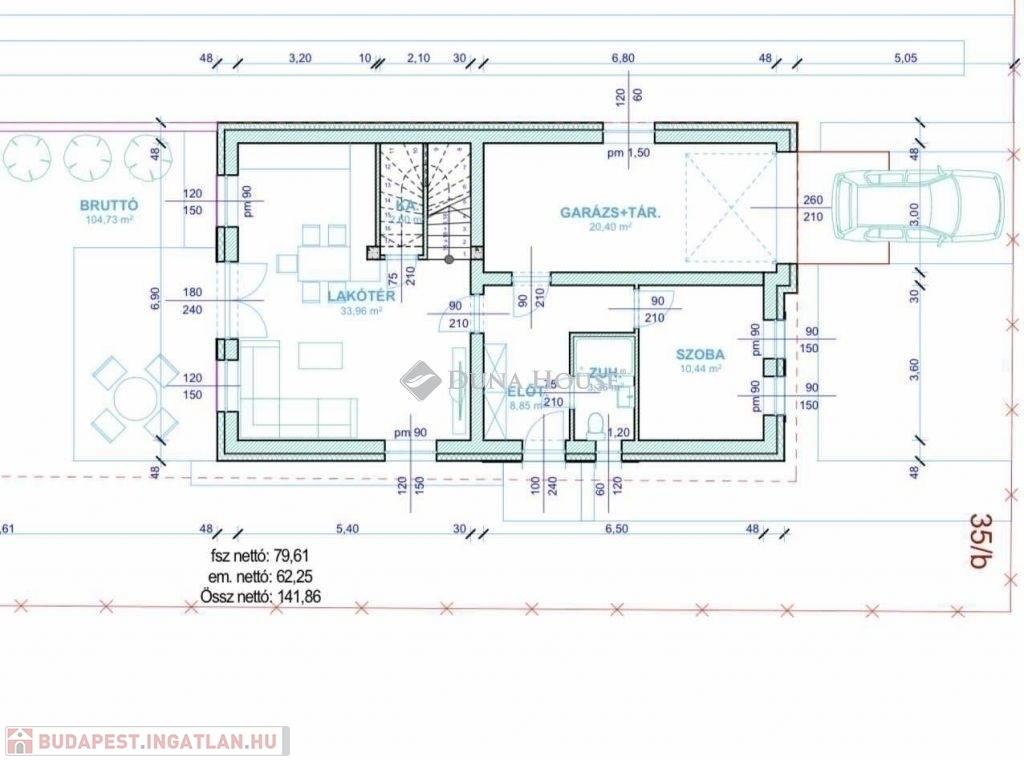 Földszinten: Tágas nappali+konyha étkező, zuhanyzó+wc, előtér, szoba, garázs 16.20 m2 , tároló