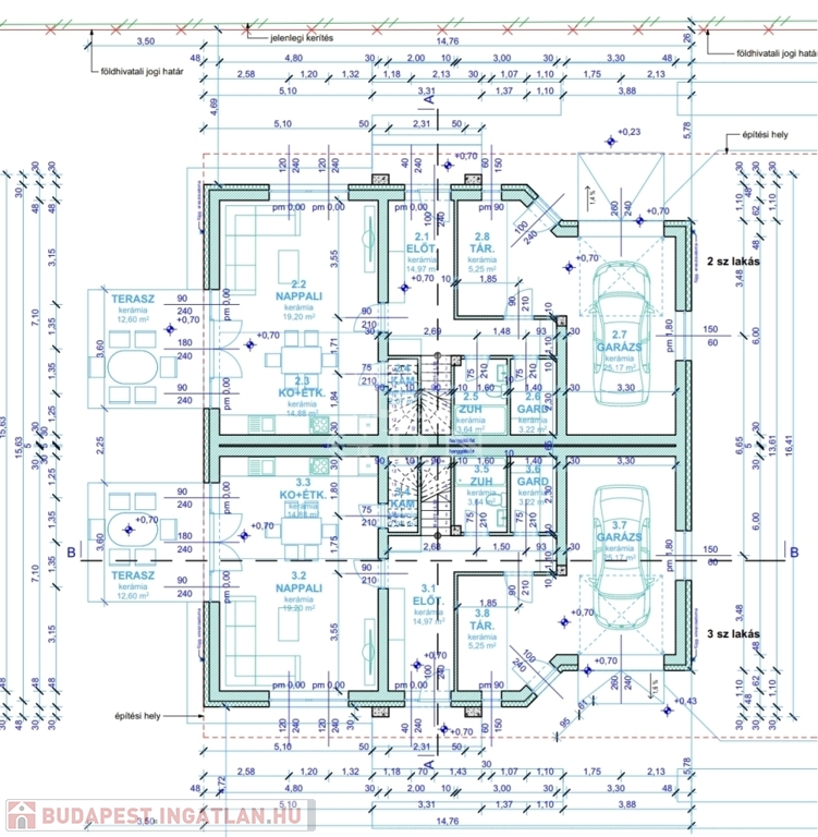 Telek: 1300 m² összesen (lakásonként min. 400 m² saját, leválasztott rész)