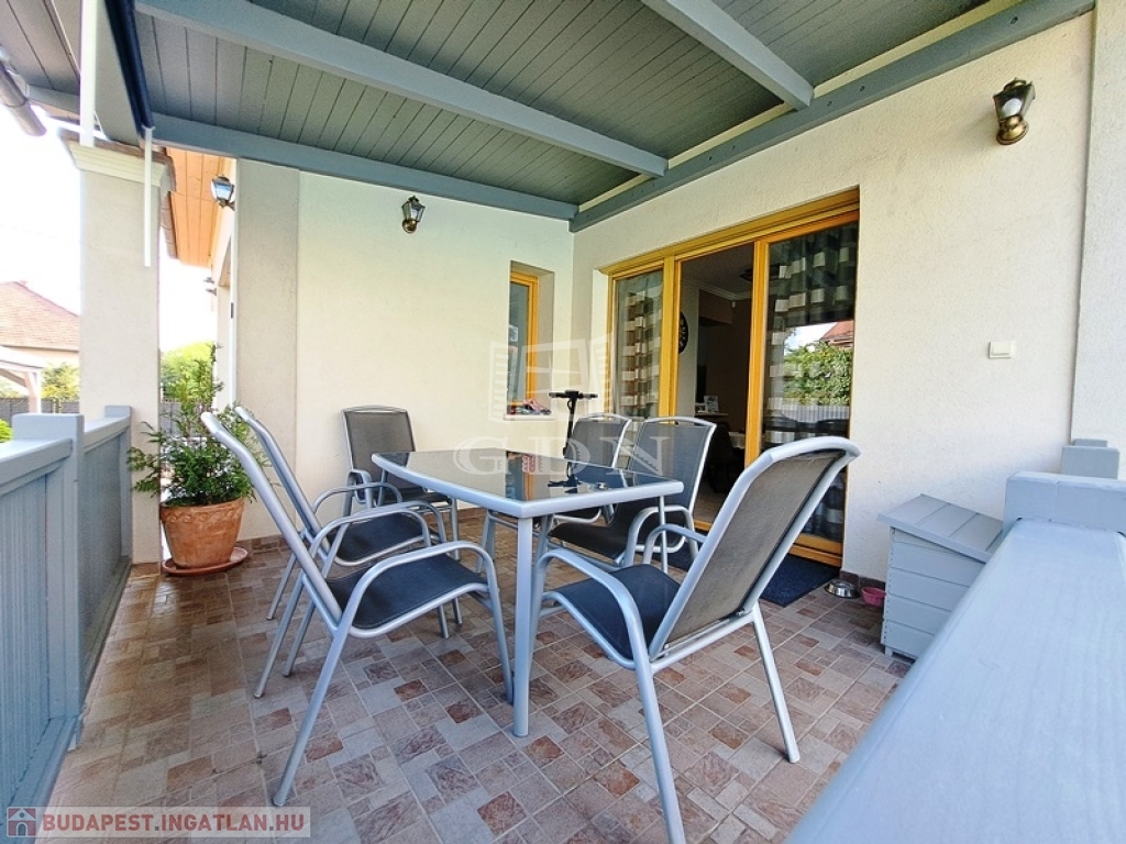 Az intim kert rendezett parkosított, két autó számára fedett autóbeálló áll rendelkezésre.A kert öntözését fúrt kút biztosítja.