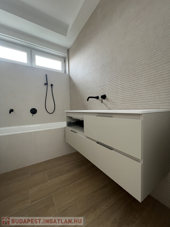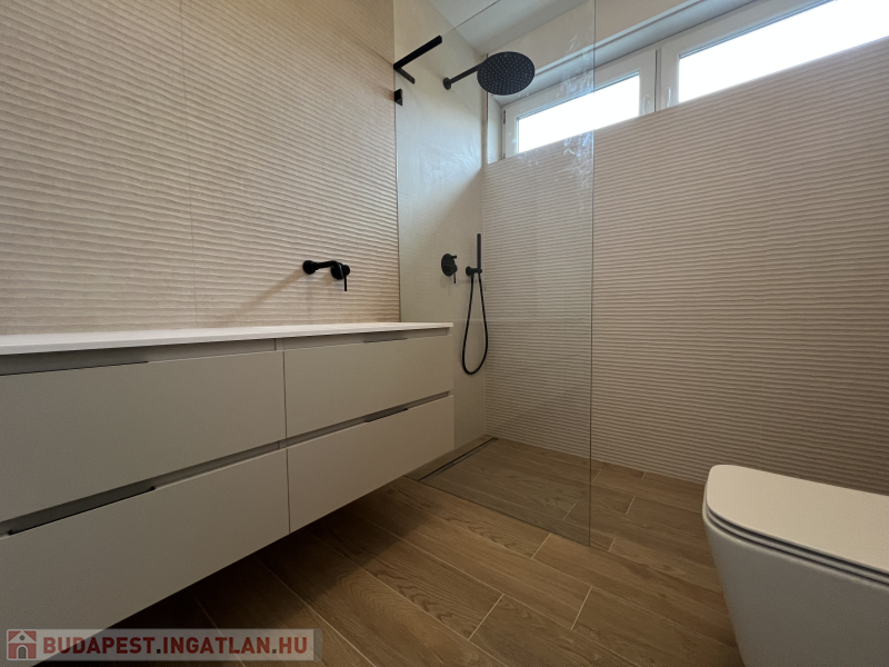 Beépített design csaptelepek, egyedi fürdőszoba szekrényekkel, design szaniterek, Geberit folyókákkal, síkba záródó egyedi belső ajtókkal, kulcslyuk nélküli, design kilincsekkel. Kiépített Okos Otthon, nagy értőképernyős riasztóval, arcfelismerős kaputelefonnal, hűtő-fűtő klímák, elektromos kapuk, elektromos garázsajtók.