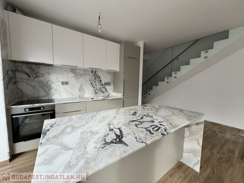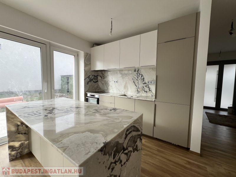 Beépített konyhabútor ( beépített Blanco mosogató, kerámialap, tűzhely, páraelszívó, mosogatógép stb.), olasz márvány burkolatokkal.