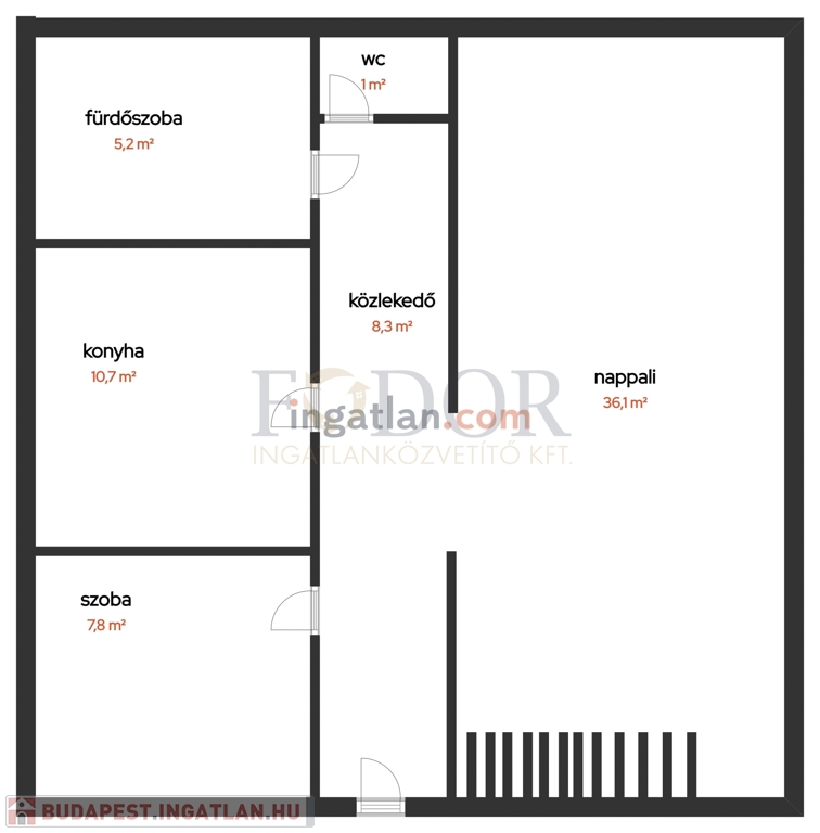 • Földszint: előszoba, közlekedő, egy szoba, konyha, fürdőszoba, külön WC, valamint egy 36 m²-es tágas nappali, fa lépcsővel az emeletre.