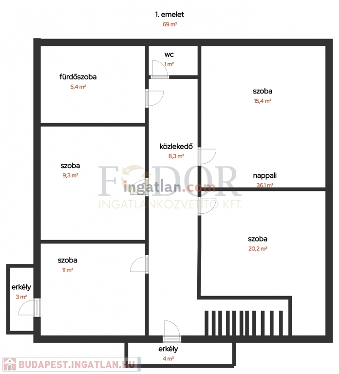 • Emelet: hosszú közlekedő (erkéllyel), külön WC, két kisebb és két nagyobb szoba, valamint egy fürdőszoba.