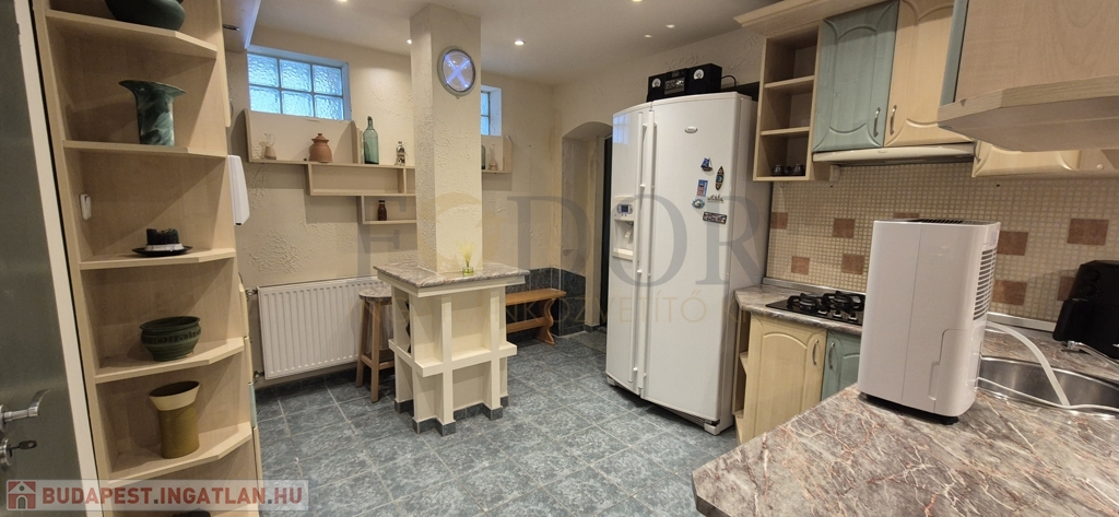• Szuterén szint (80 m²)felújított, modern hidegburkolatokkal : Előtér, 2 szoba, konyha+étkező, kamra, fürdő, wc.