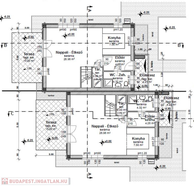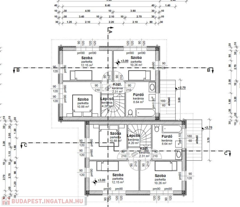 Műszaki:Vasbeton sávalap, dupla fal a lakások között , 30-as Porotherm tégla teherhordó falak, 10-es Porotherm válaszfalak, vasbeton közbenső és fa emeleti födém. A külső falak 12 cm-es Dryvit hőszigeteléssel, az emeleti födém 30 cm-es (fújható cellulóz )hőszigeteléssel készül, cserép héjazással. Nyílászárók(Schüco típusú ) 3 rétegű hő- és hangszigetelő thermo üveggel, kívül,belül fehér színben. Fűtés és a meleg víz hőszivattyúról H tarifával, mindenhol padlófűtés . 1 darab hűtő -fűtő klíma 3,5KW-os nappaliban , összesen 5 db. klíma kiállás a hálószobákban,nappaliban, lépcsőházban.