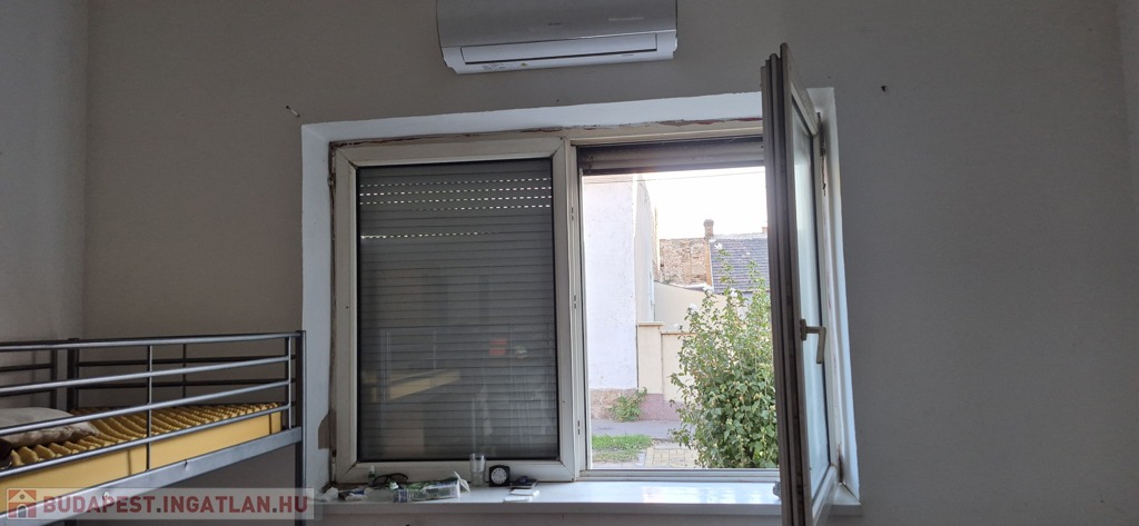 Újak a nyílászárók, laminált padlós a szoba, mely 19m2, ebből nyílik egy 7m2-es fél szoba, innen nyílik a tusoló, WC,