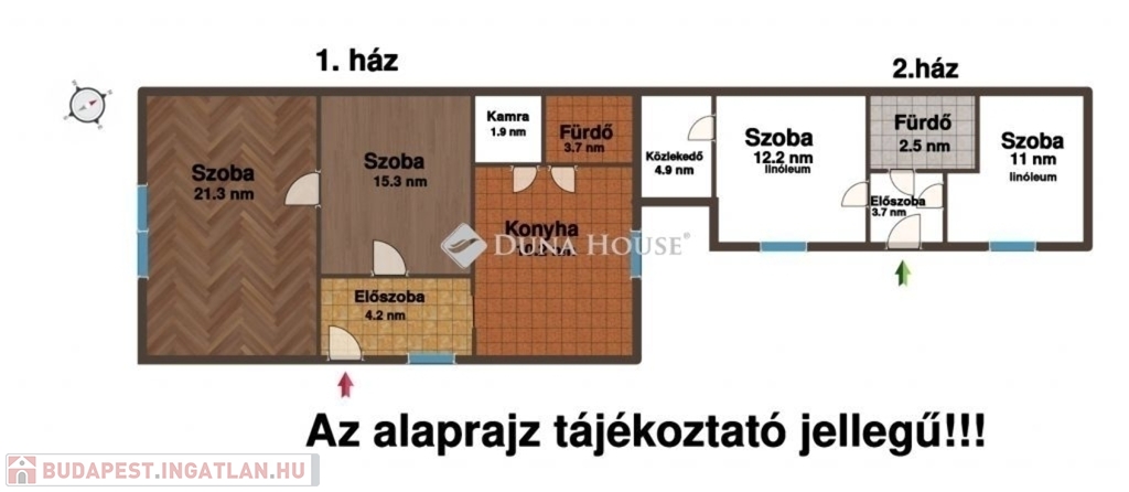Elrendezése: Előszoba, két szoba, zuhanyzós fürdő toalettel és egy közlekedő, amely az első házzal köti össze. Itt be lett építve az ajtó amely bármikor ki szedhető és össze nyitható a két ingatlan.