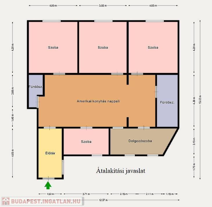 A ház adottságainak köszönhetően lehetőség nyílik egy fantasztikus elosztású, amerikai konyhás nappali + 4 hálószobával rendelkező családi otthon kialakítására, melyről átalakítási javaslat is látható a képek között.