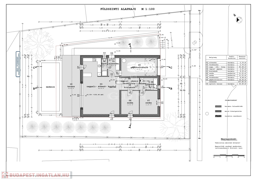 •Szerkezet: Monolit vasbeton sávalap (C20-as betonminőség), 30 cm-es szigetelésű betonfödémmel, homlokzati fal 15 cm-es, lábazatra 10 cm-es hőszigetelés kerül felhelyezésre.