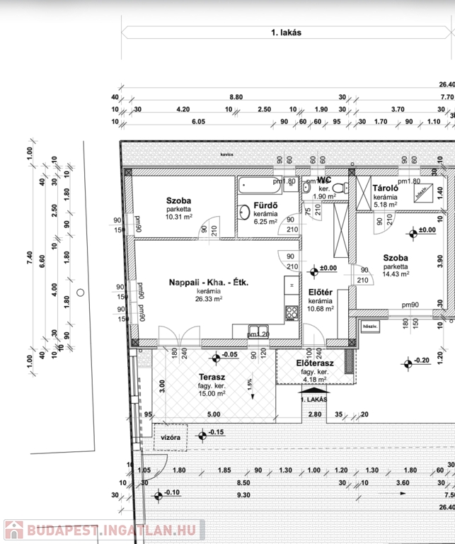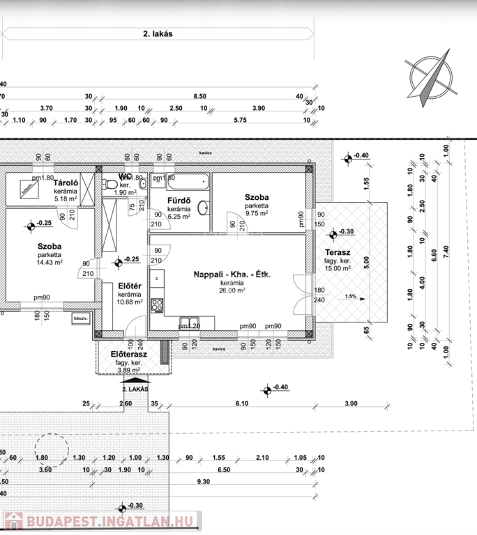 -előszoba(10,68m2), amerikai konyha nappali(26m2), 2 szoba(9,75m2, 14,43m2), fürdőszoba(6,25m2), WC(1,9m2), tároló(5,18m2), valamint 15 m2 és 3,89 m2-es terasz.