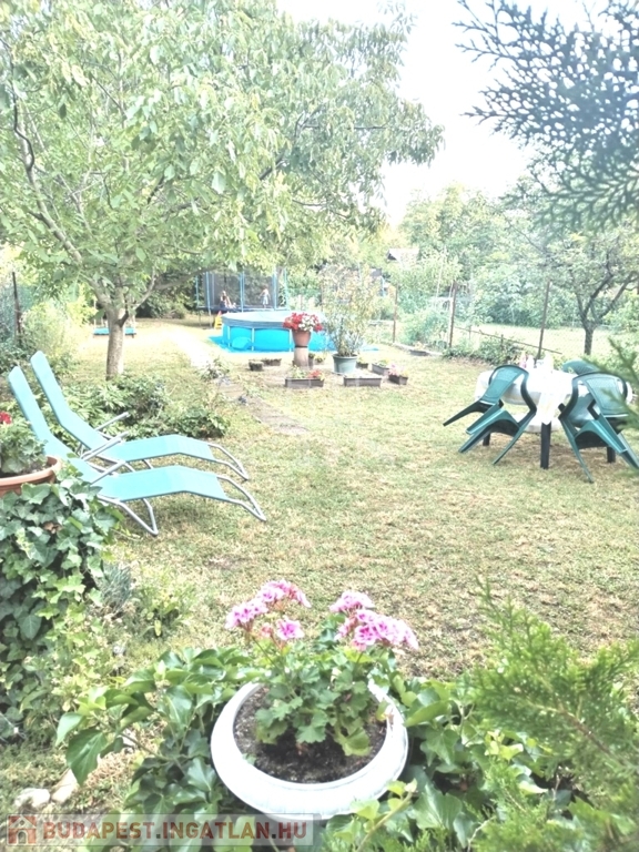 Tágas kert: örökzöldek, diófa és rózsabokrok biztosítják a nyári árnyékot és a privát pihenést!