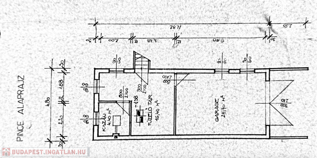 - Pince: tároló (24,4m2), tároló (16,4m2), kazánház (4,4m2), dupla garázs (40m2).