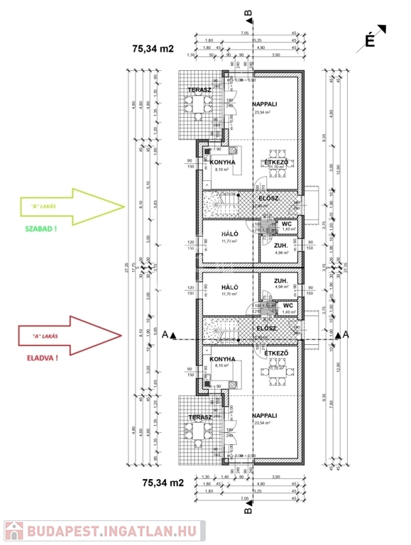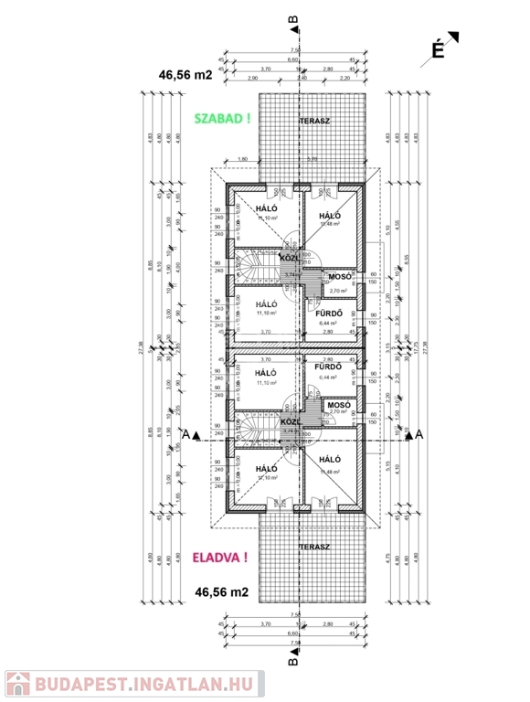 A ház felépítése: földszint + teljes értékű emelet, az eladásra kínált ingatlan a hátsó ikerházfél azaz a : " B LAKÁS" !