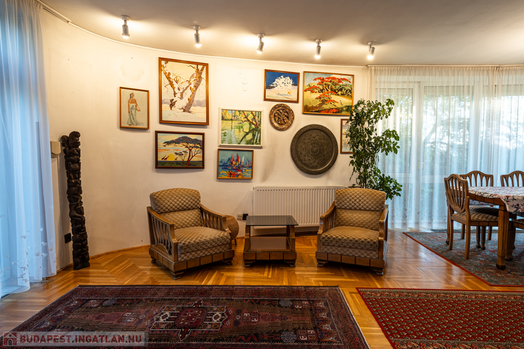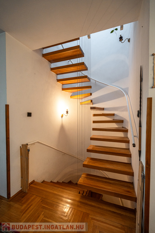 The living room, separate living area and bedrooms are covered with parquet, the unique internal staircase consisting of steps built into the wall is made of hardwood, the other rooms and the garden terrace opening from the living room are covered with tiles. The 550 m2 garden is covered with lush vegetation.