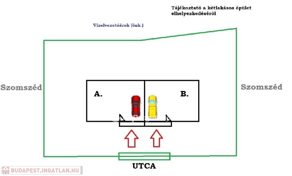 A telek remek adottságainak köszönhetően széles az utcafront, így a telket pont el lehetett felezni az A. és B. épületekhez. Mindkét lakrészhez saját garázs és kert, valamint önálló fogyasztásmérők lesznek.