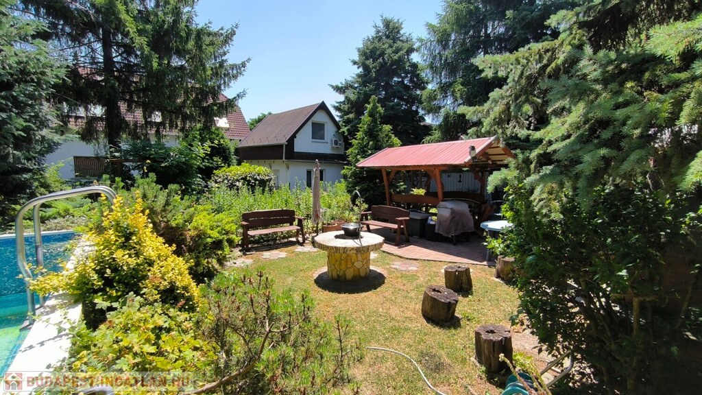 In a quiet residential part of Budatétény, a truly exceptional property is for sale on a 1655 m² double plot with two separate houses. The landscaped garden with a private pond, wooden bridge and swimming pool is a rare highlight. The main house offers 240 m², the guest house 34 m², both with multiple usage possibilities.