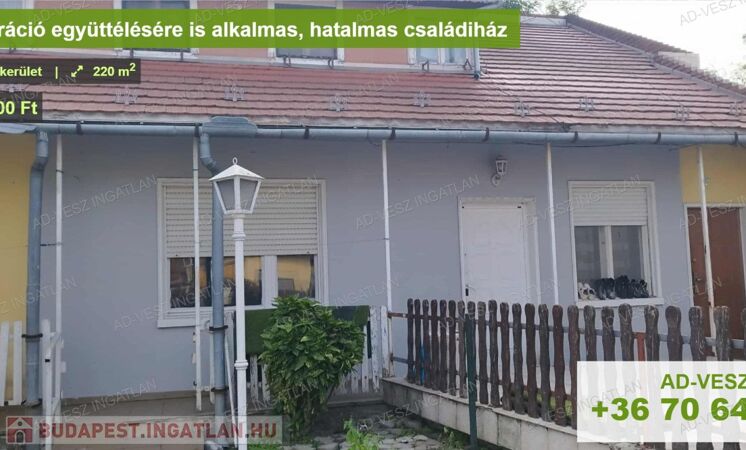 Budapest XXIII. kerületében, Soroksár csendes részén eladó egy vegyesfalazatú, (vályog, és tégla) 220m²-es családi ház, 440m²-es, két utcára nyíló saroktelken.