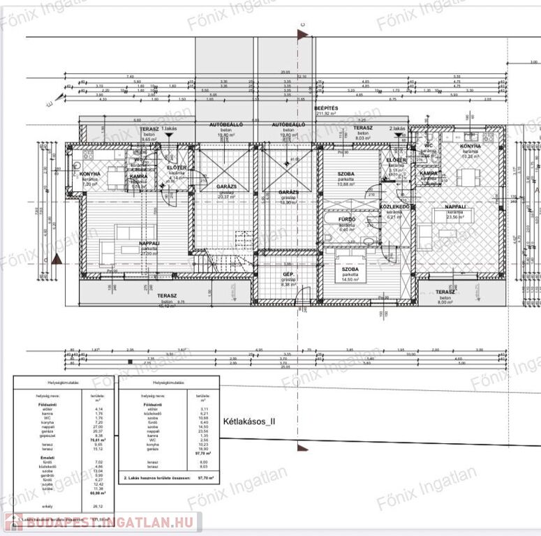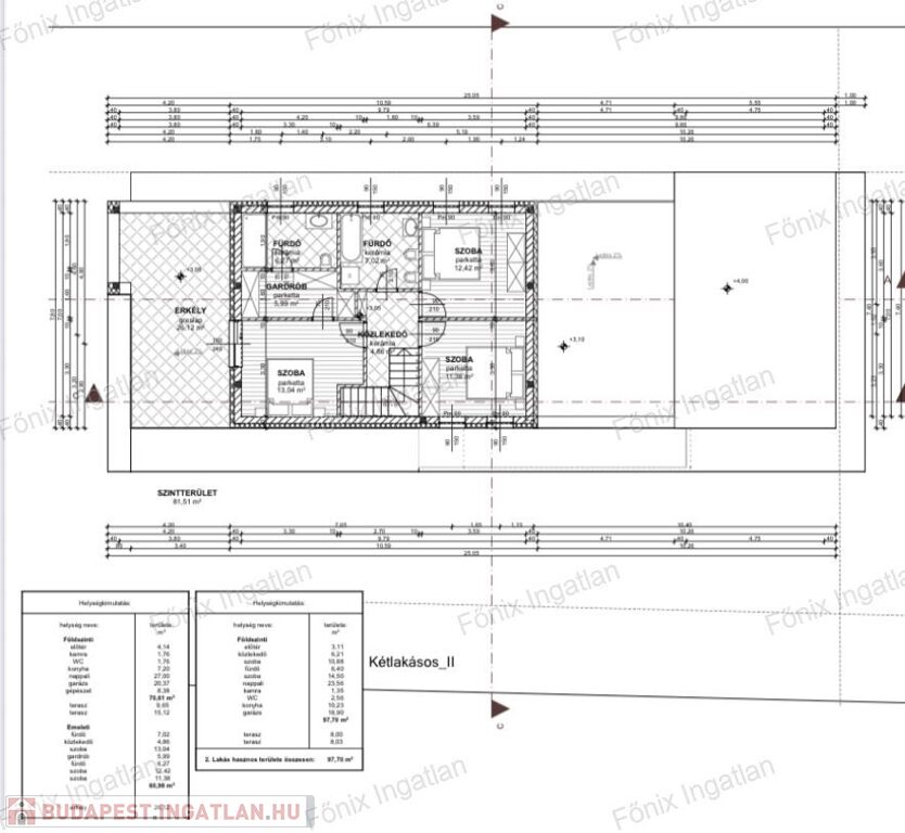 132 m2-es + összesen 25 m2 földszinti terasszal + 26 m2 emeleti erkéllyel,