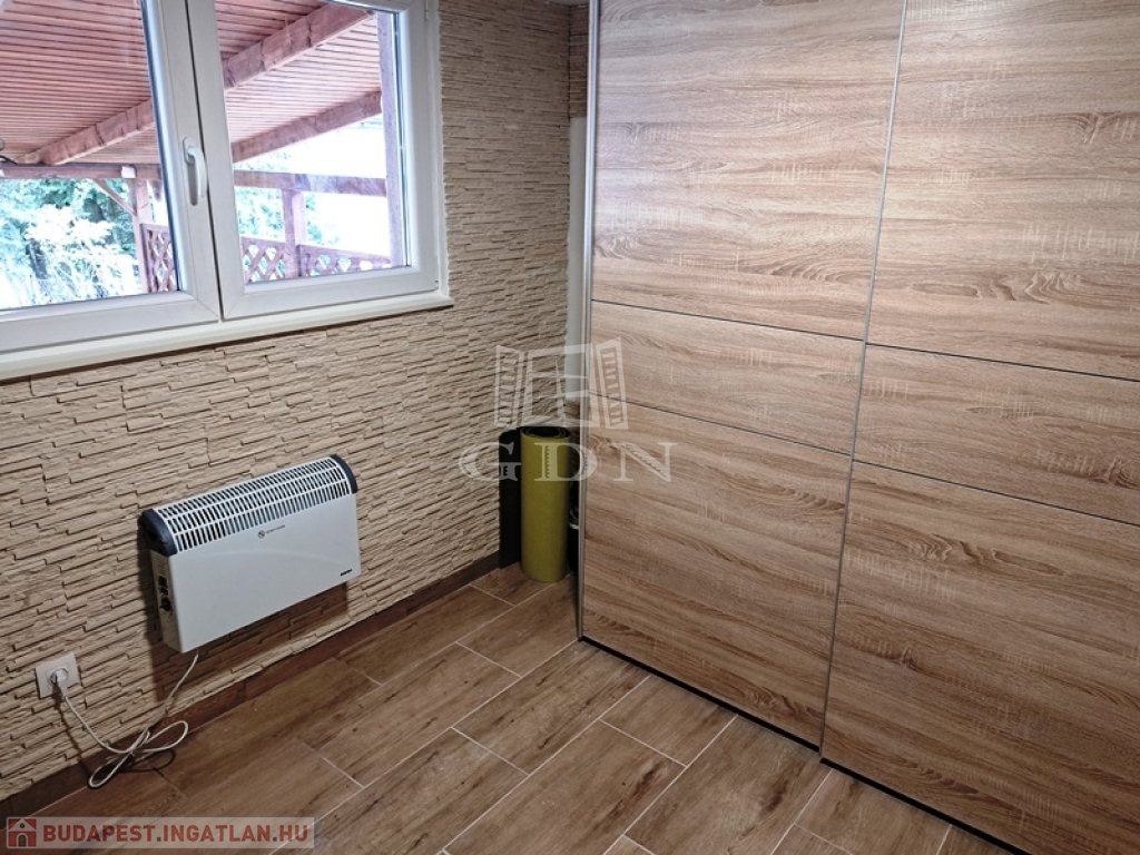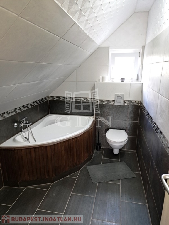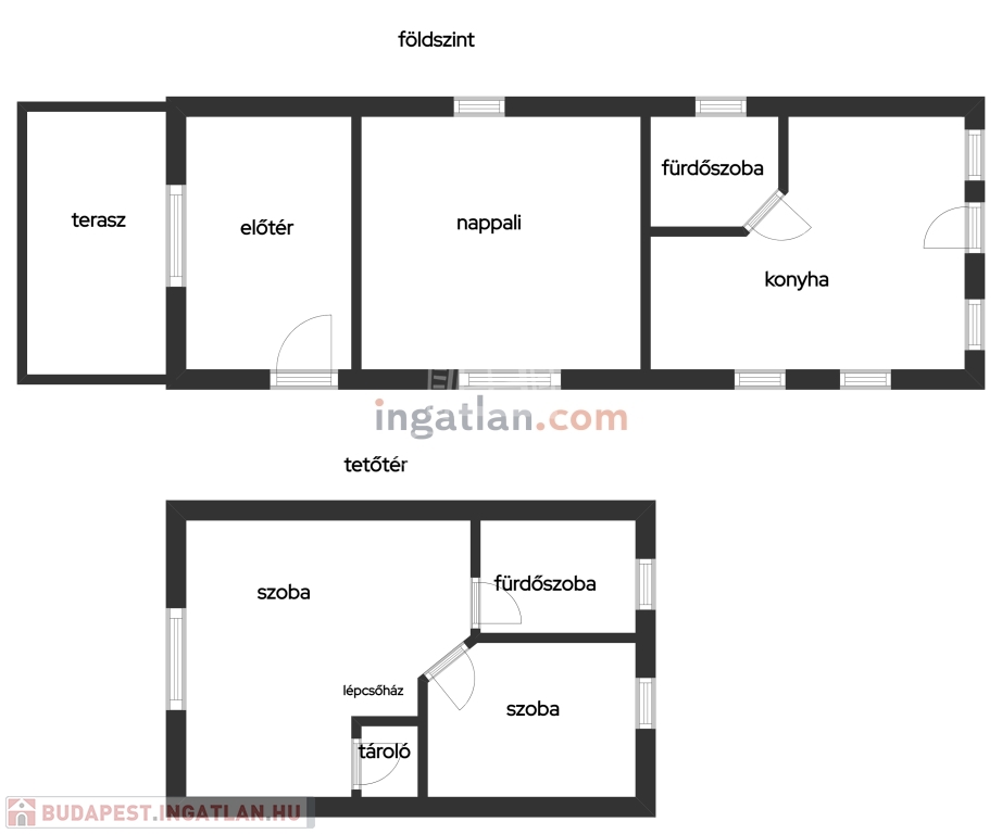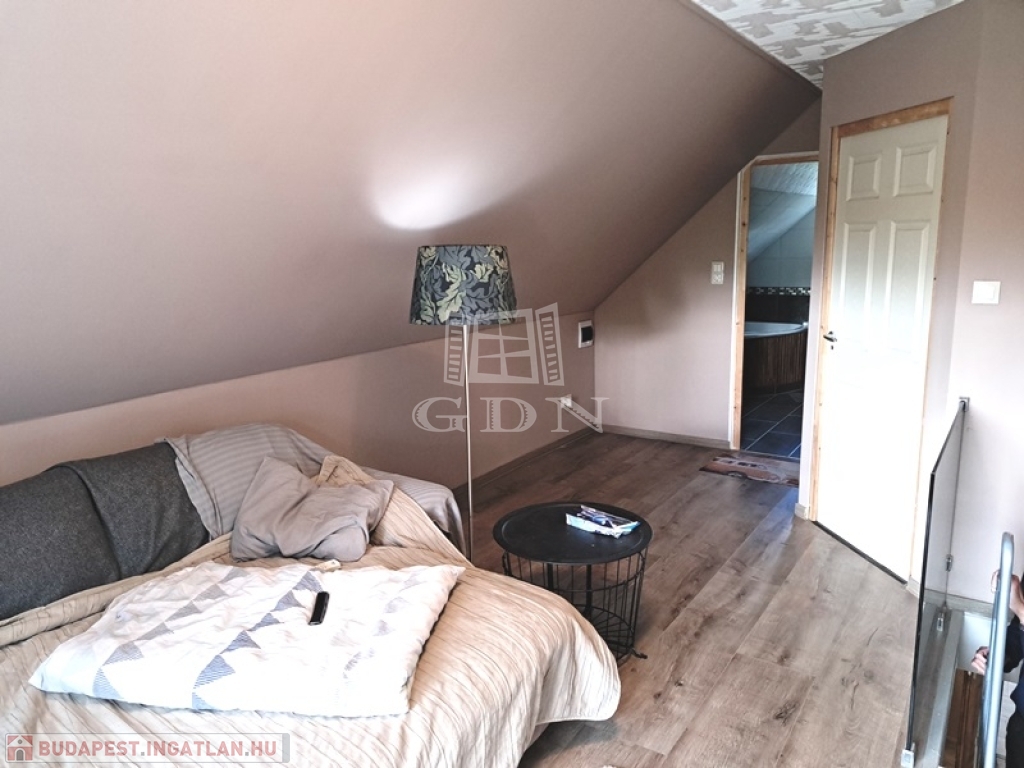 Helyiségei:alsó szint, előtér, nappali, konyha/étkező, fürdőszoba zuhannyal, fedett terasz, felső szint, 2 szoba, fürdőszoba, tároló.