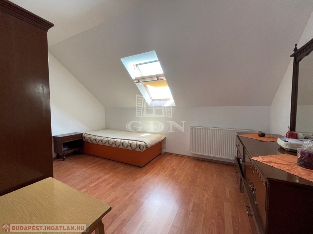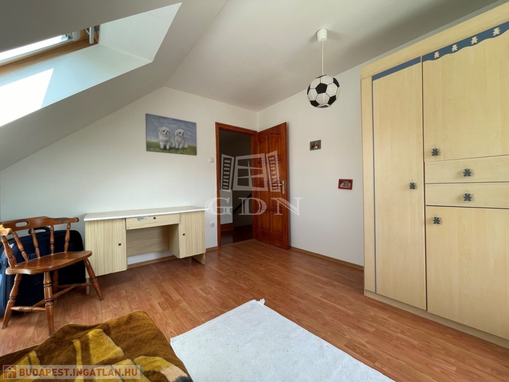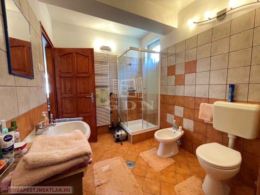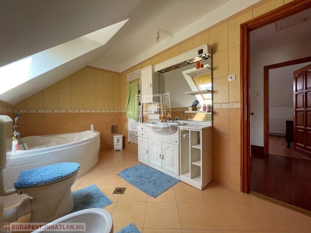 - Tetőtér: Egy tágas falépcső vezet az emeletre, amely tetőtér: egy kisebb előtérről nyílik a 3 szoba, hatalmas fürdőszoba sarokkáddal, WC, bidé.