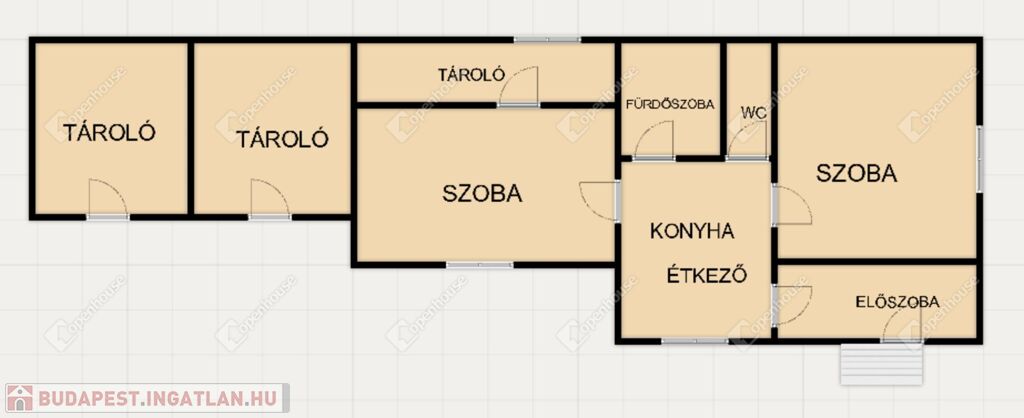 Praktikus elrendezése jelen kialakításában: előszoba-közlekedő, konyha-étkező, két külön nyíló kényelmes méretű szoba melyek egyikéhez egy kisebb négyzetméretű tároló kapcsolódik (akár gardrób, akár más funkció is kialakítható belőle), fürdőszoba, wc külön.