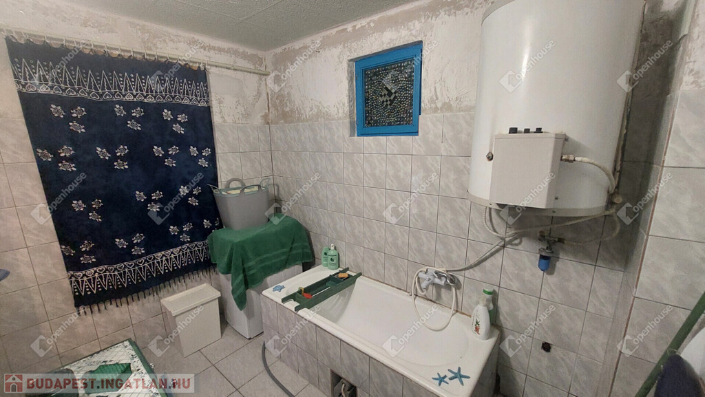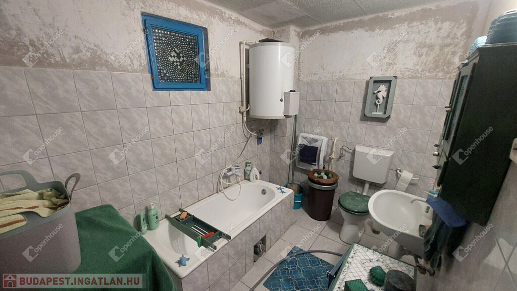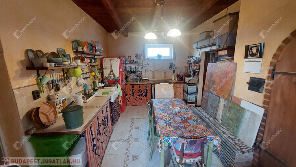 A konyha egyedi hangulatát a téglából épített, rusztikus jellegű konyhabútor-alap adja. A beépített sütő és főzőlap a vételár részét képezi, valamint a stílusban hozzá illő csaptelep és mosogató is beépítésre került. A melegvizet gázbojler biztosítja. A fürdőszoba nagyméretű káddal felszerelt.
