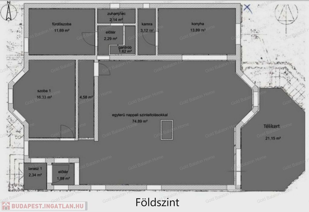 - földszint helyiségei: előszoba, 89 nm-es amerikai konyhás nappali, kamra, hálószoba, fürdőszoba 2 személyes káddal, külön WC, téli kert