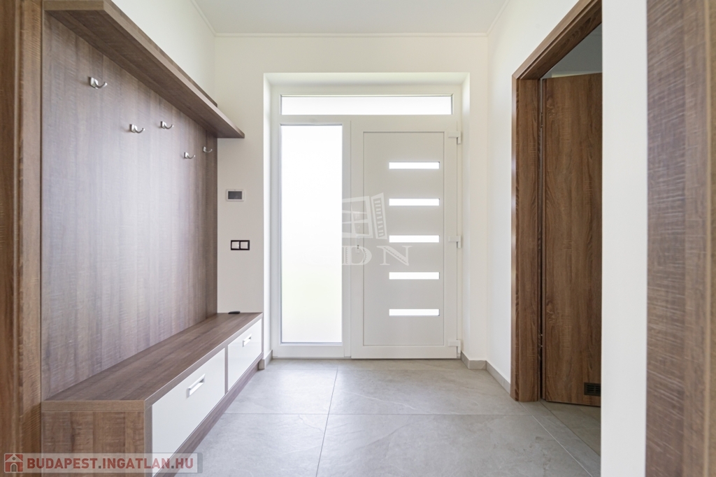 A családi ház padló fűtéssel és mennyezet hűtéssel rendelkezik, minden helyiség hőmérséklete egyedileg szabályozható.