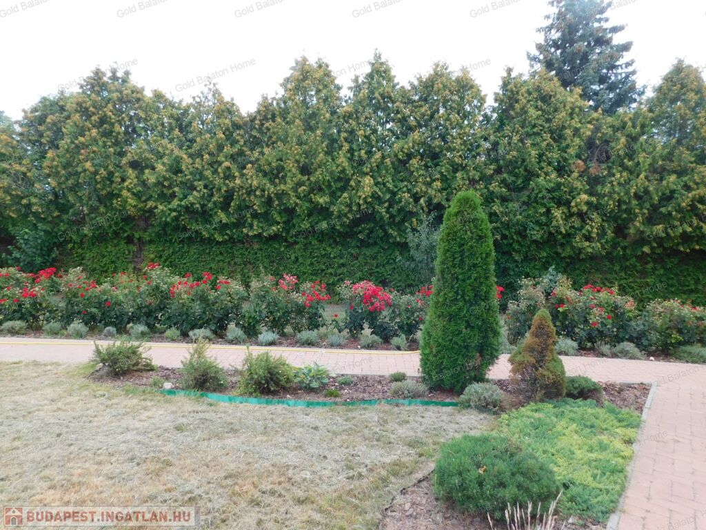 - körbekerített telek, virágokkal, rózsákkal beültetett kert