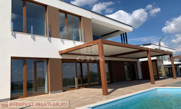 A földszint 170 nm ahol egy hatalmas egylégteres nappali-konyha-étkező, galériás előszoba, főháló gardróbszobával saját fürdő és wc-vel, háztartási helyiség, vendég wc, gépház, 2 beállásos garázs és az 50 nm-es pergolával fedett terasz találhatók. A teraszon található 3,5x6m-es MEDENCE és panorámás üveg falú FINN SZAUNA fokozza a valódi luxus érzést, ami a ház minden apró részletében megmutatkozik.