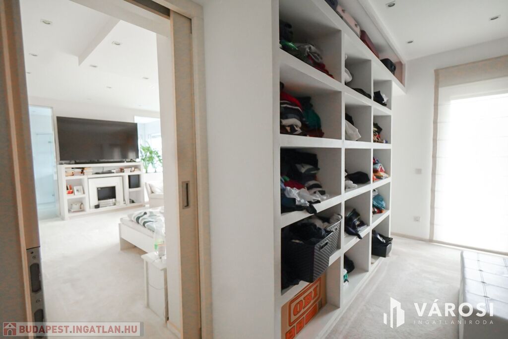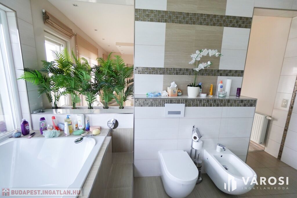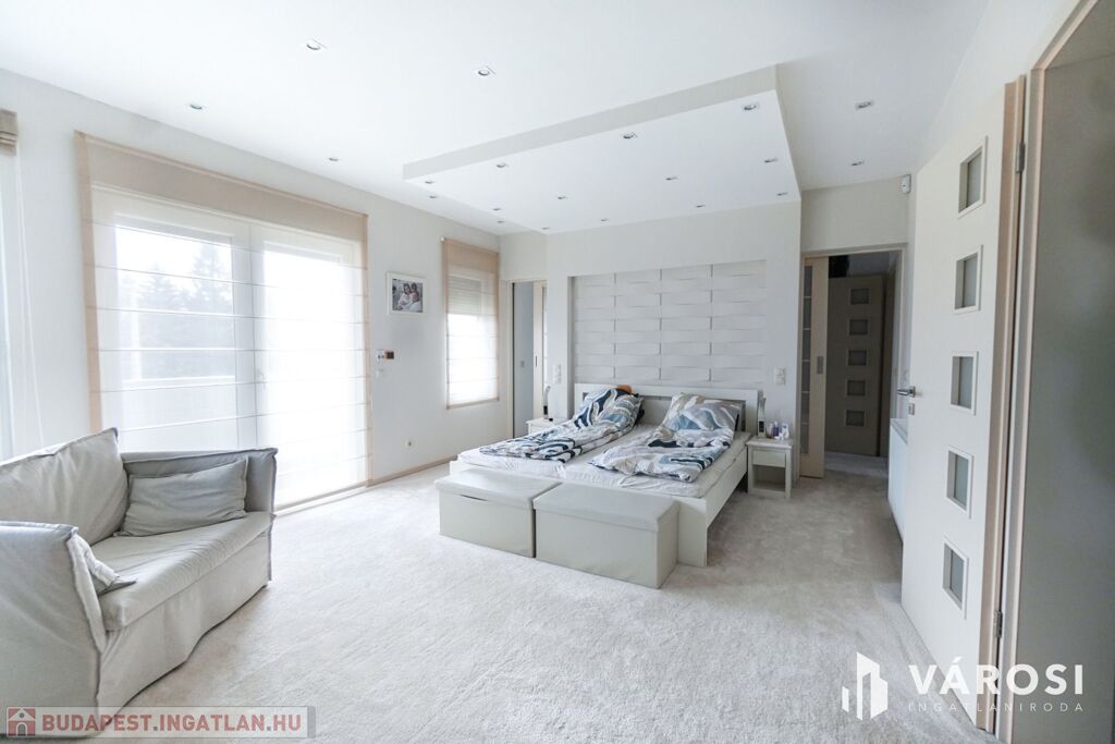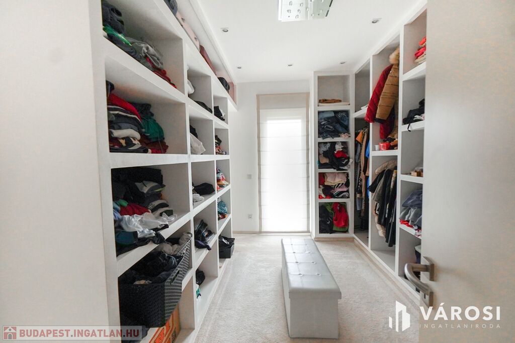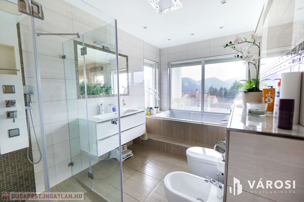 Az emeleti fürdőből egyedülállóan élvezheti a táj szépségeit akár fürdés közben a szintén nagyfelületű ablakoknak köszönhetően. Tágas gardrób, padlófűtés, dekorvilágítás, mosószoba.