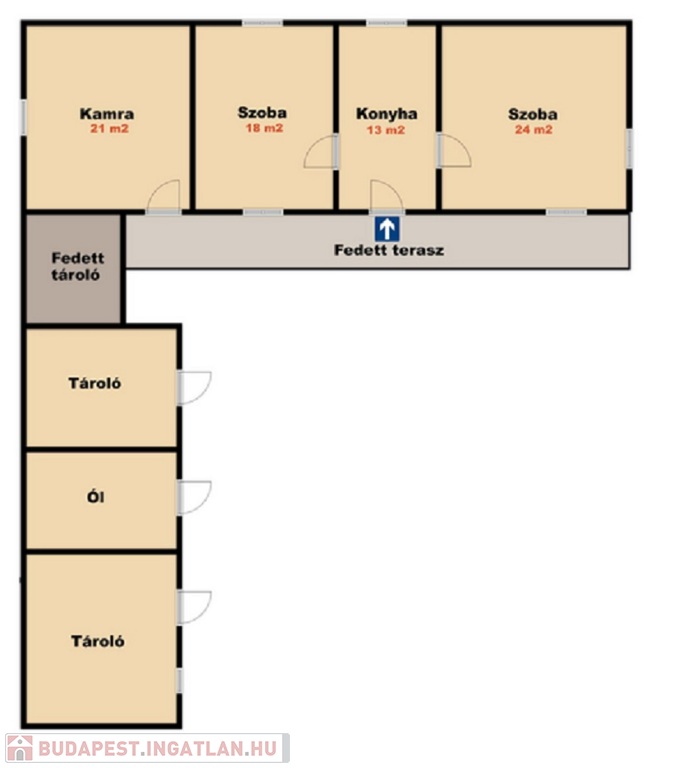 Tanya 55 m2 lakóterületű, vert falazatú, amelyben kialakításra került: 2 szoba, konyha és kamra.