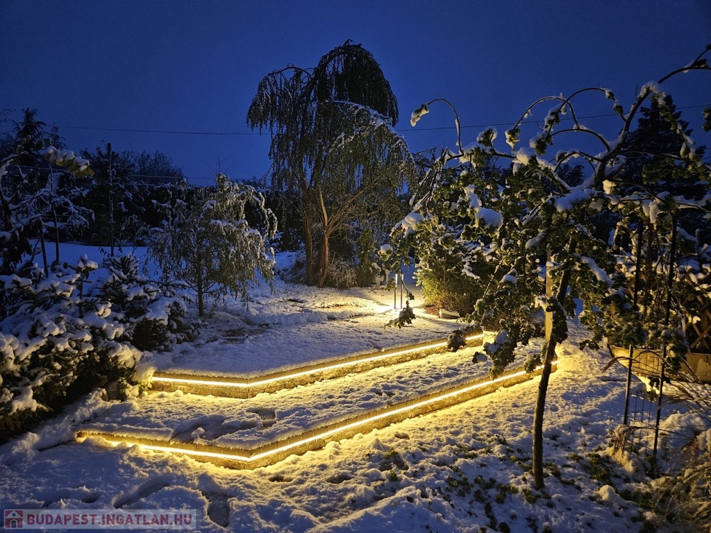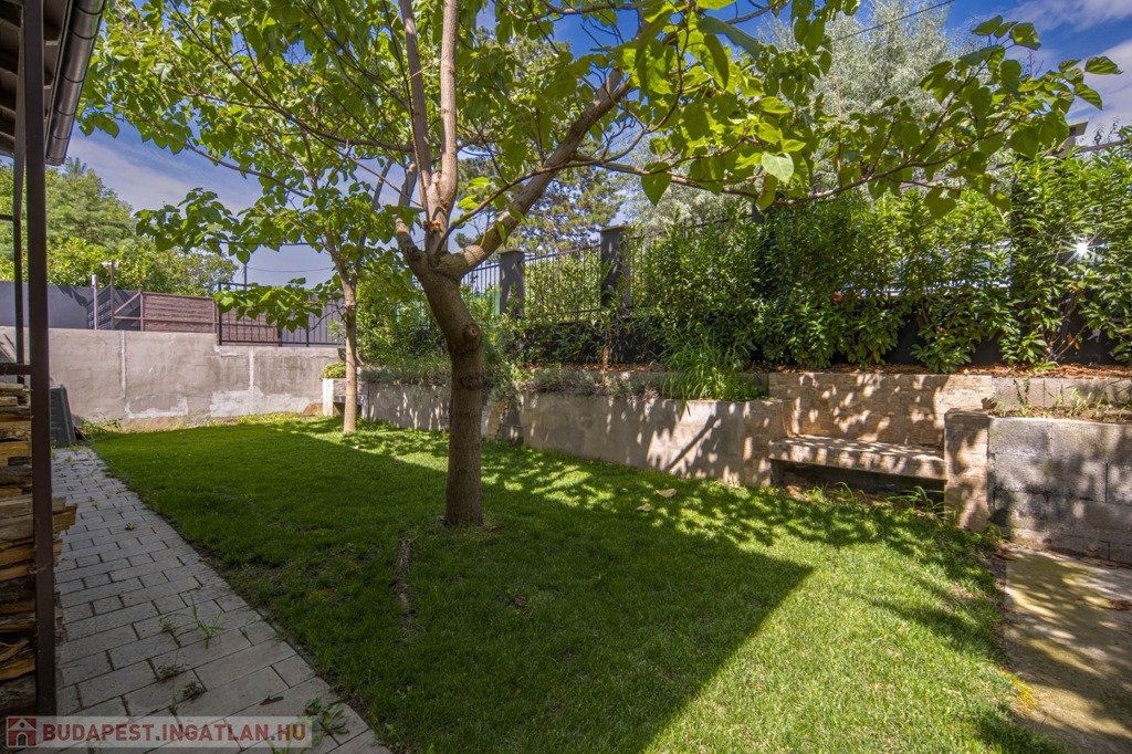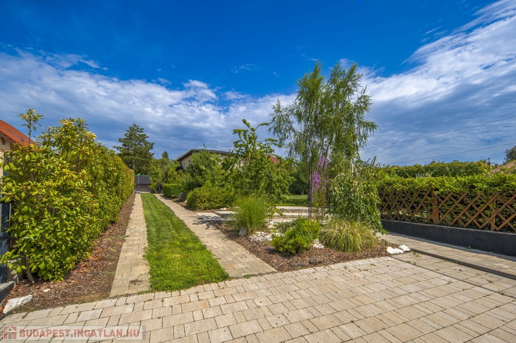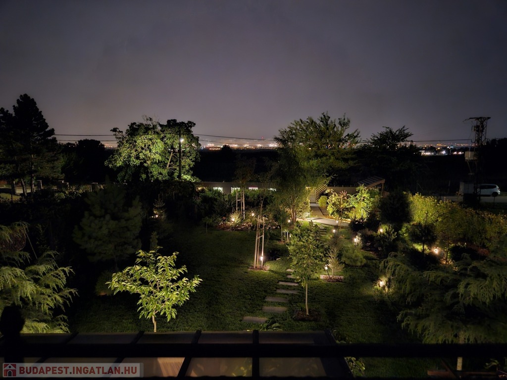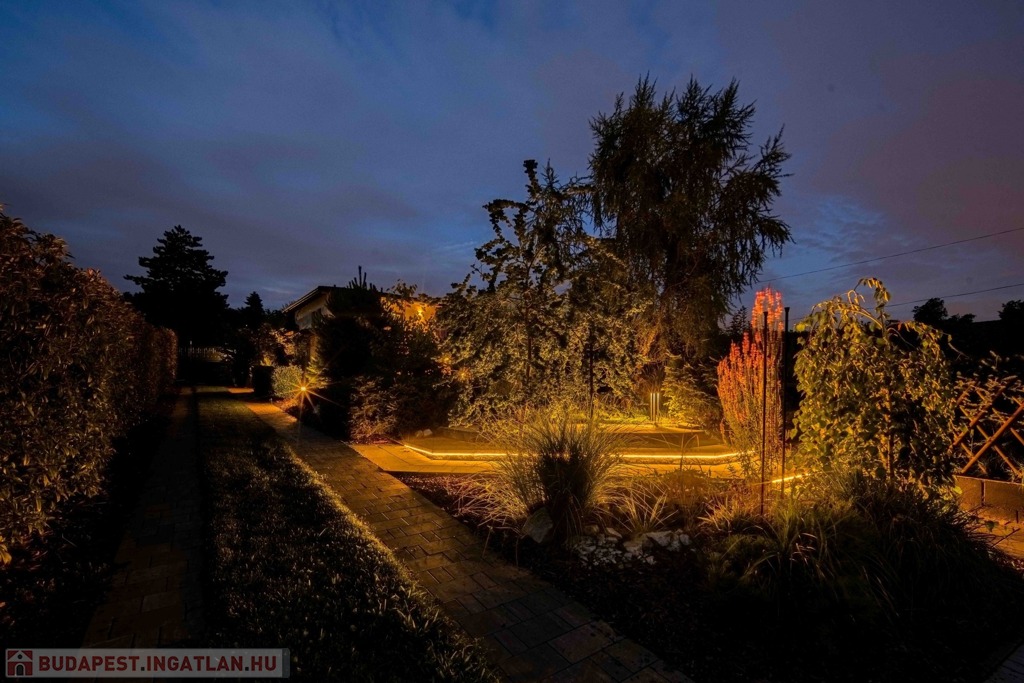 A telken mediterrán fű, autómata öntözőrendszer, fúrt kutak és rengeteg különleges fa és cserje saját gyökéröntözéssel.