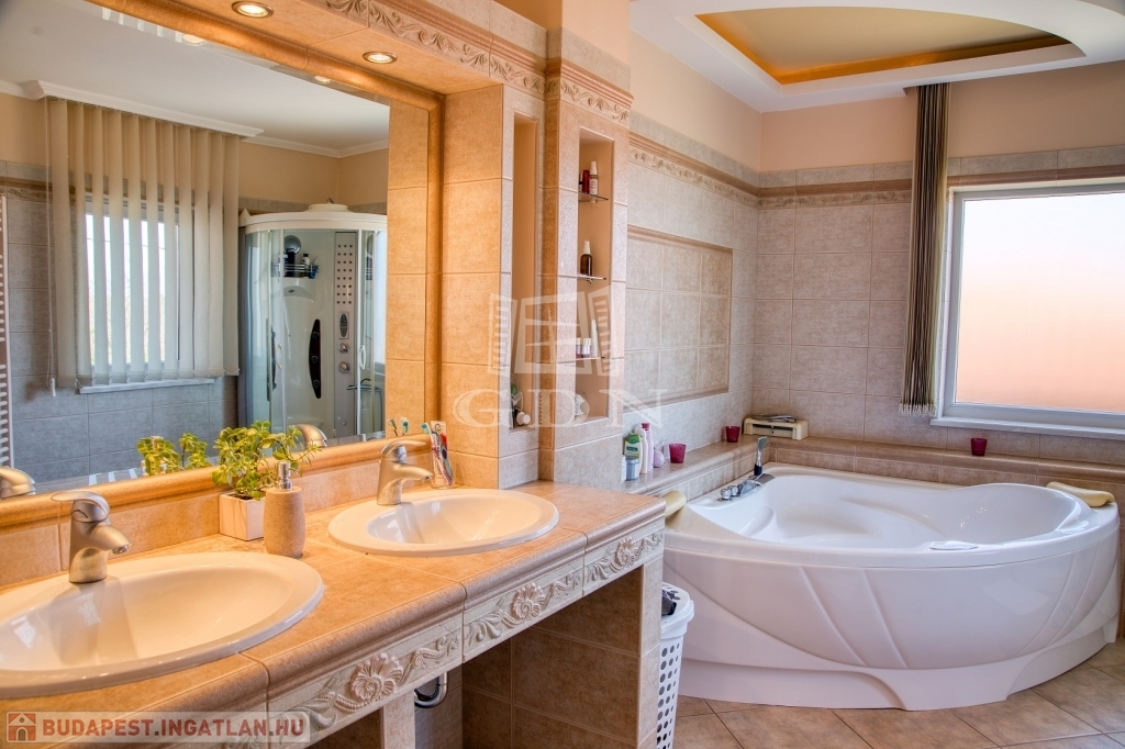 - tágas fürdőszoba (zuhanyzós gőzkabinnal, fényterápiás hidromasszázs két személyes káddal, dupla mosdóval, bidével),