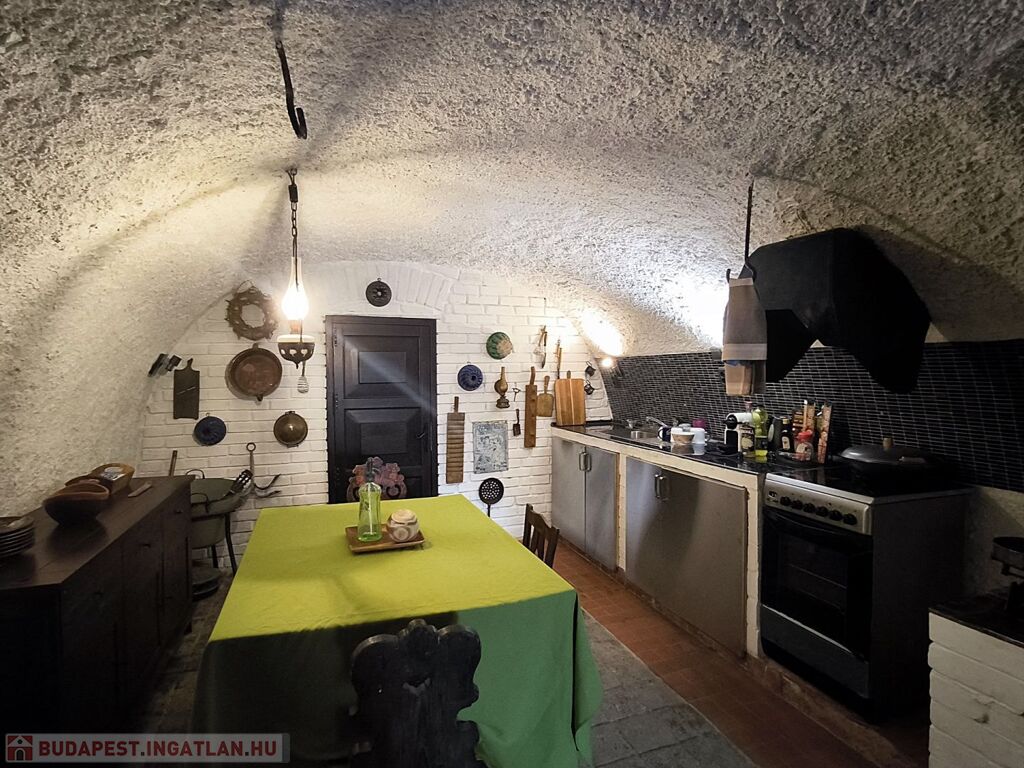 Az épület egy része földben lévő, földdel borított, vastag kő falakból álló pince. Ebben a részben található az étkező- konyha fa tüzeléses búbos kemence, egy kádas fürdőszoba és egy tároló.